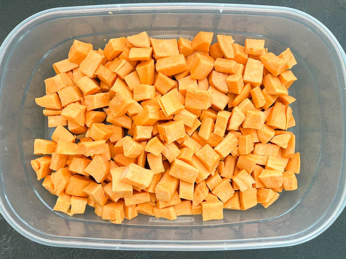 - Cut the sweet potatoes into evenly sized cubes and soak them in water overnight in the fridge. You can soak them up to 48 hours if you'd like.