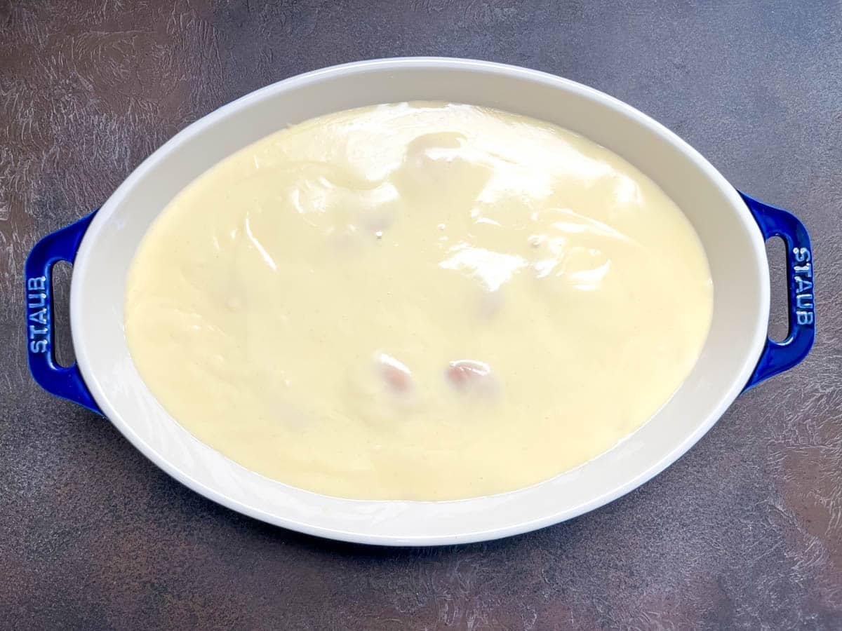 Place the pot inside so the bottom touches the water, then heat gently over low to medium heat. This gentle method prevents scorching and helps the pudding cook slowly for a silky smooth texture.