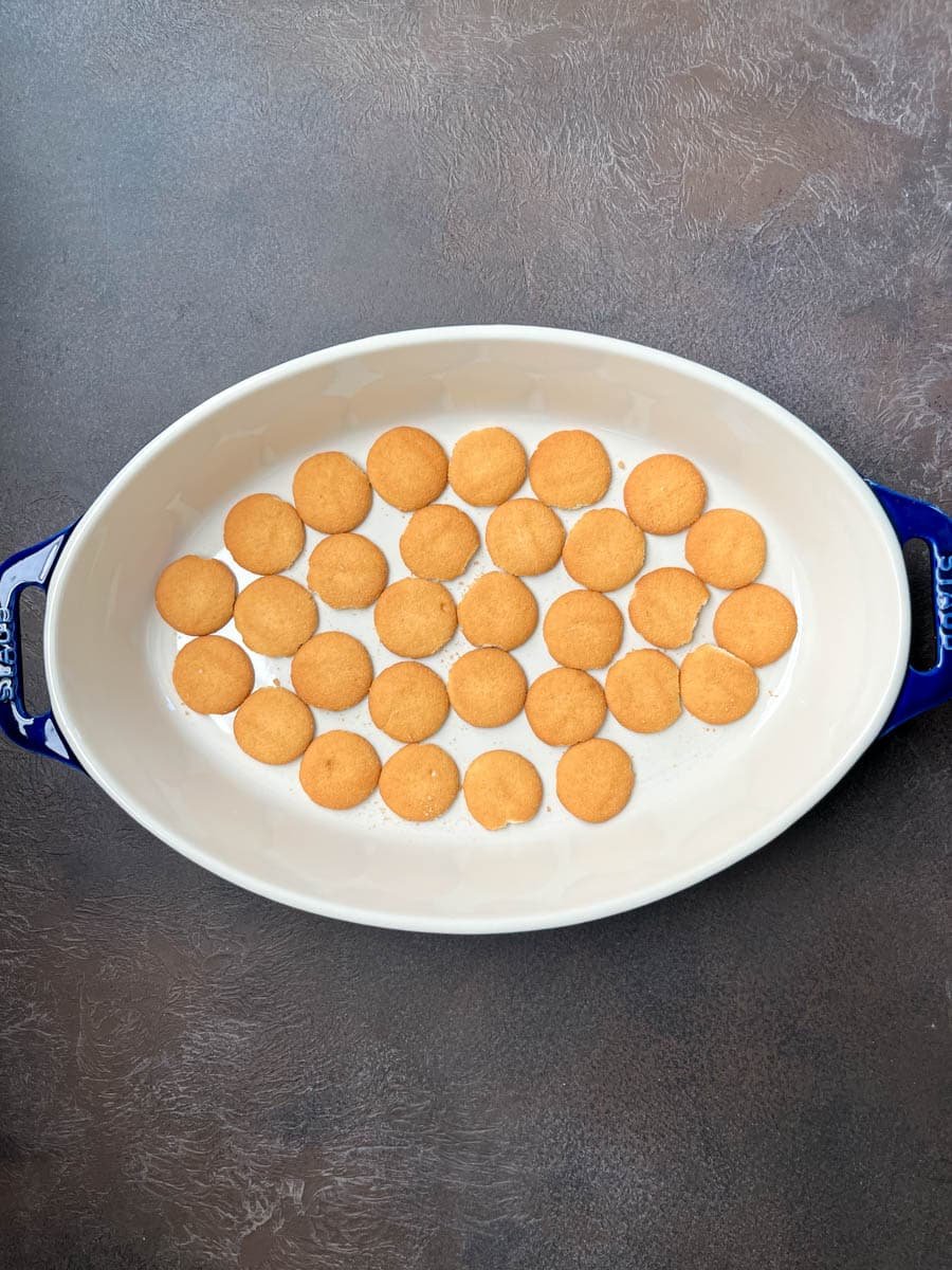 Arrange Nilla wafers in a single layer across the bottom of a casserole dish.