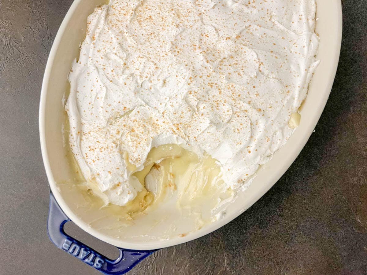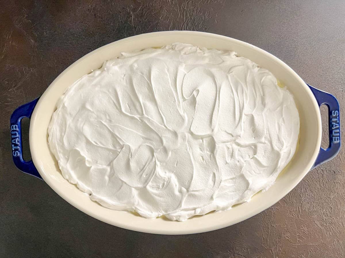- Once the pudding has fully chilled, spread whipped topping evenly over the top.