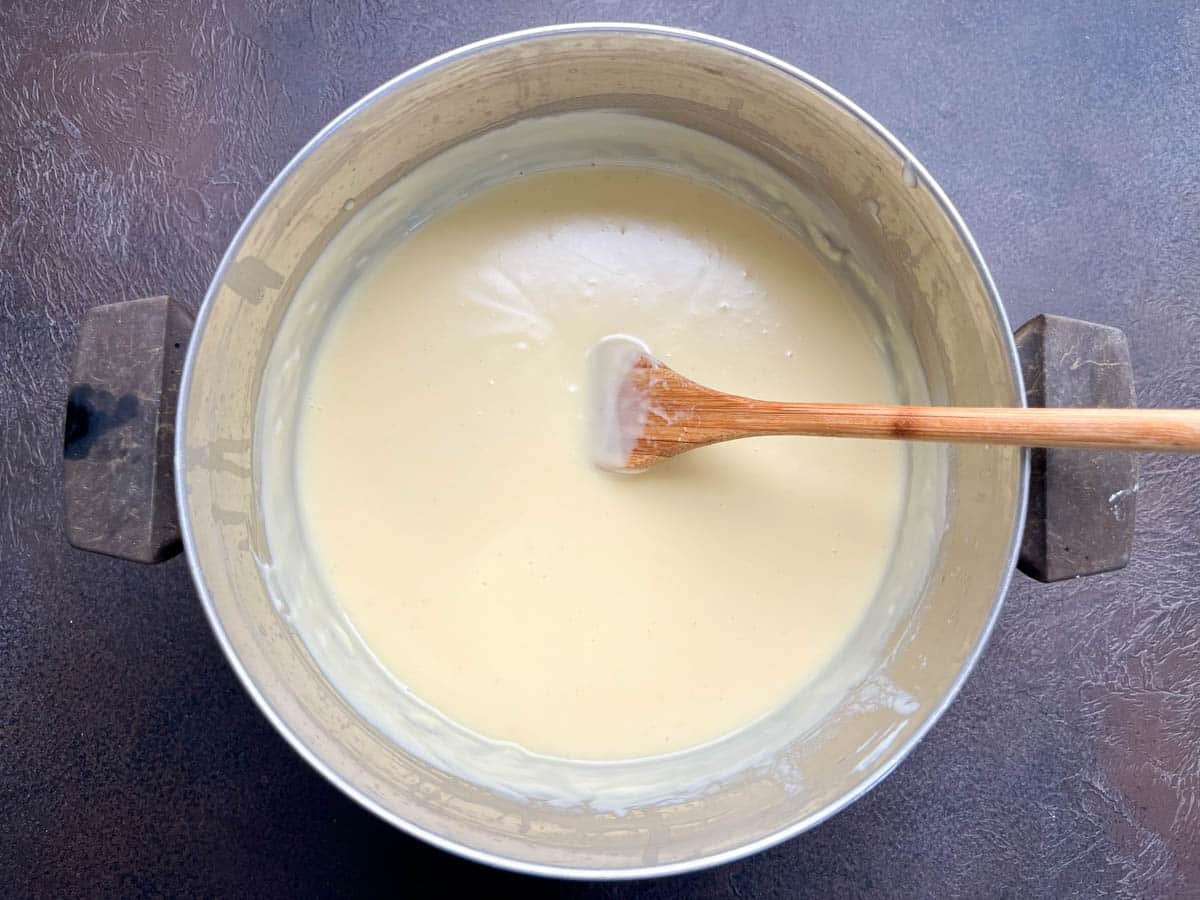 Start whisking continuously and use a wooden spatula or spoon to gently scrape the sides and bottom of the pot until you get a smooth, silky, thick creamy pudding.